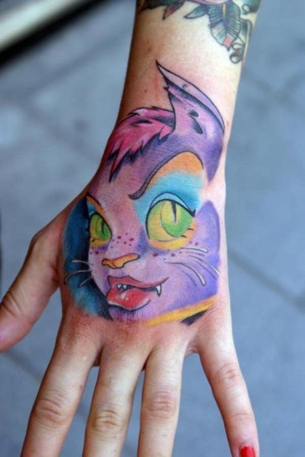 手背old school彩色滑稽幻想猫卡通纹身图案