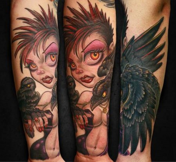 手臂彩色性感女巫与乌鸦卡通纹身图案