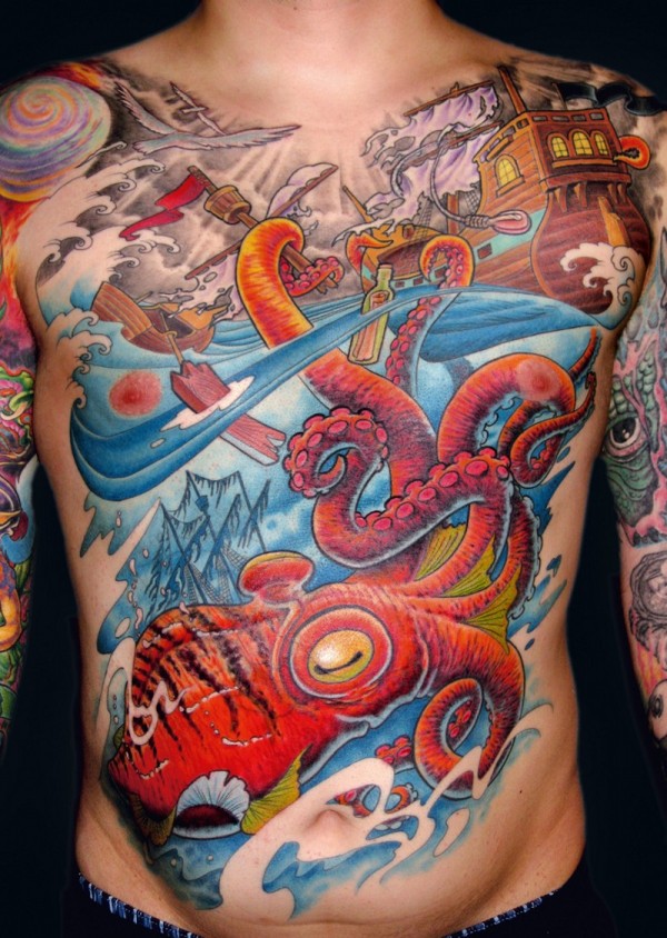 腹部卡通彩绘章鱼攻击帆船纹身图案