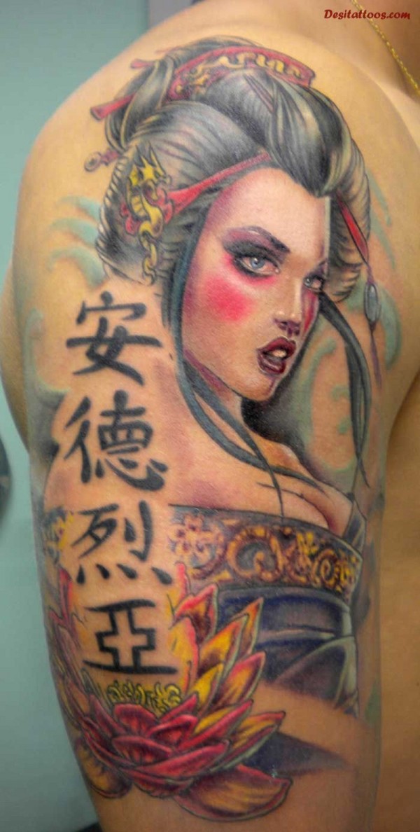 大臂中国风彩色性感艺伎与汉字纹身图案