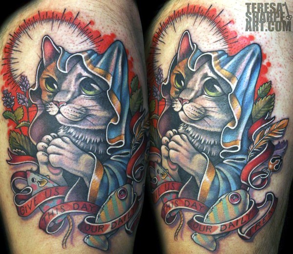 有趣的卡通祈祷猫和鱼老鼠纹身图案