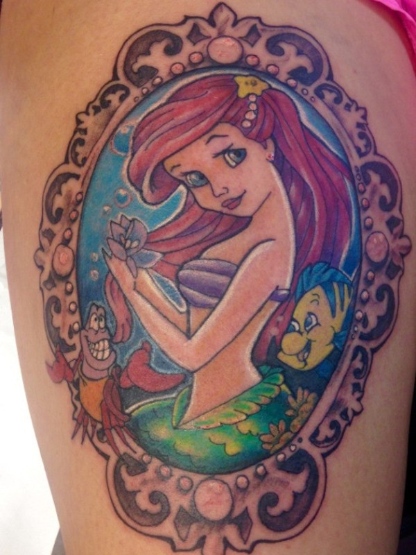 卡通美人鱼和比目鱼传统彩色纹身图案