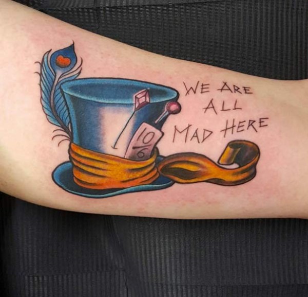 小臂有趣的彩色卡通帽子与字母纹身图案