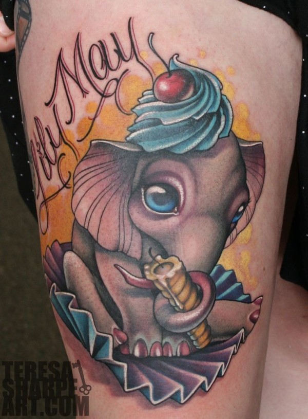 大腿可爱的卡通彩色大象和蜡烛和字母纹身图案