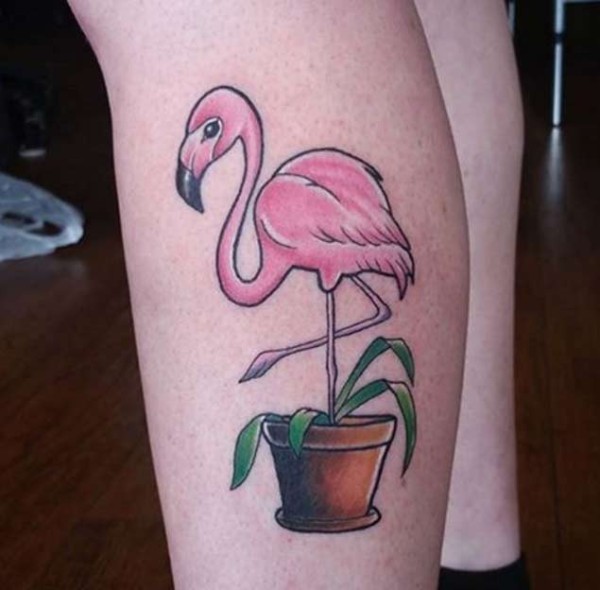 小腿粉红色的卡通火烈鸟与花盆纹身图案