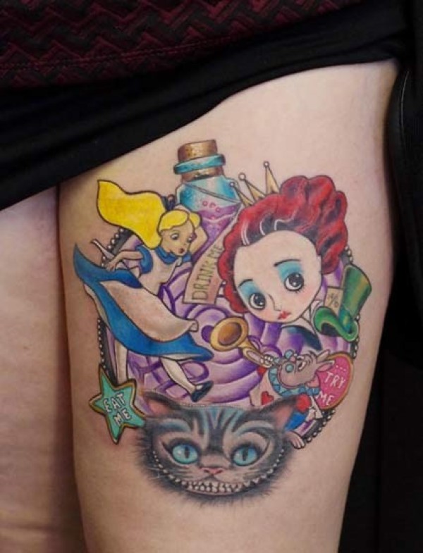 大腿有趣的彩色卡通爱丽丝纹身图案
