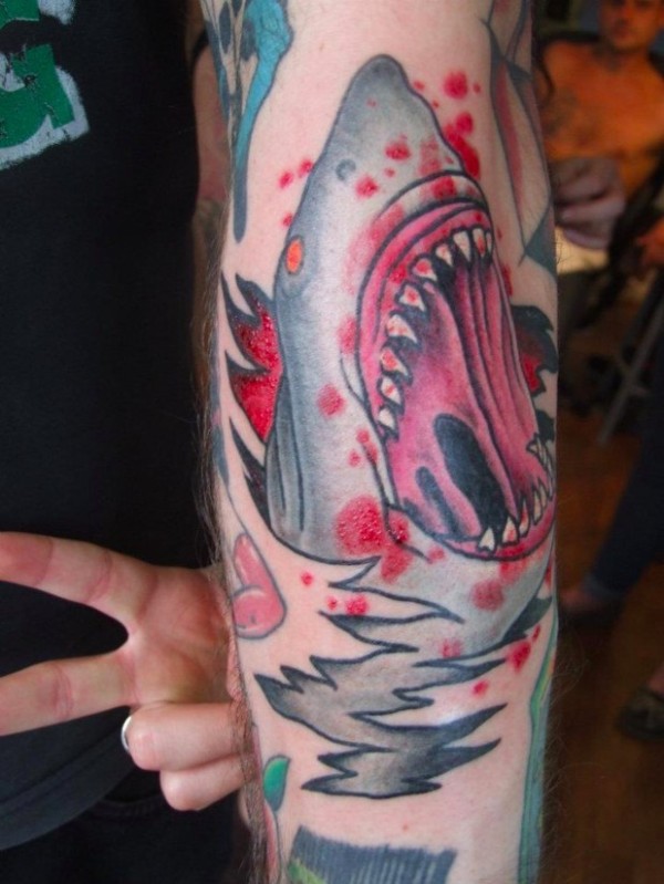 old school手臂彩色邪恶血腥鲨鱼纹身图案
