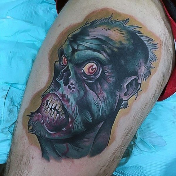 大腿彩色有趣的僵尸脸卡通纹身图案