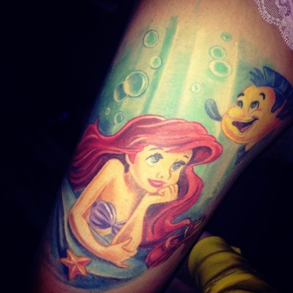 卡通美人鱼艾莉尔和牙鲆鱼纹身图案