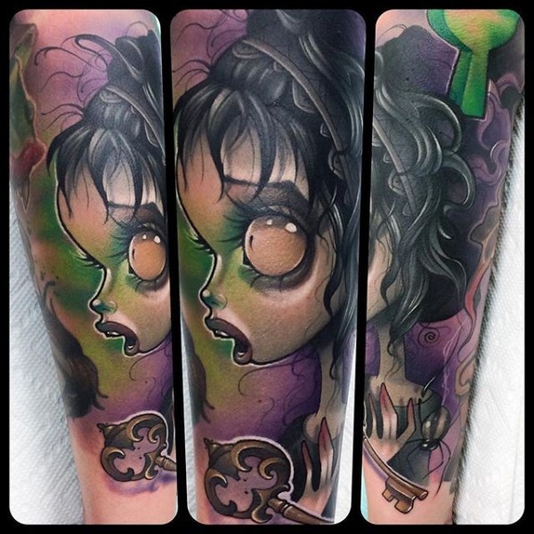 邪恶的大眼睛女巫和钥匙卡通纹身图案