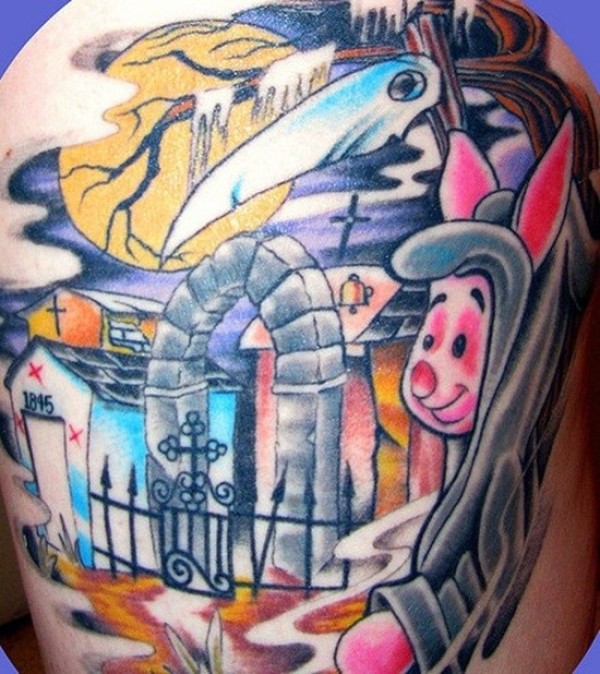 彩色卡通小猪和死亡墓地纹身图案