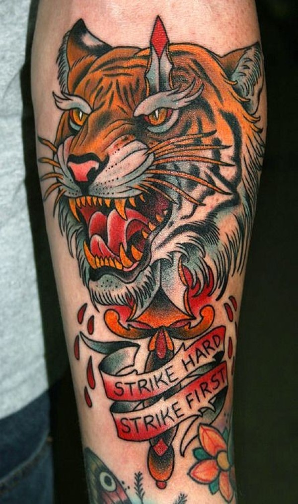 手臂卡通老虎头和血腥匕首字母纹身图案