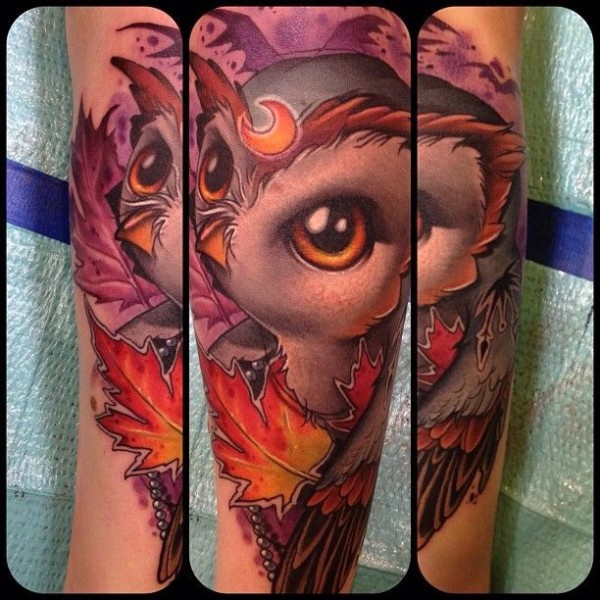 小臂彩色滑稽卡通猫头鹰纹身图案