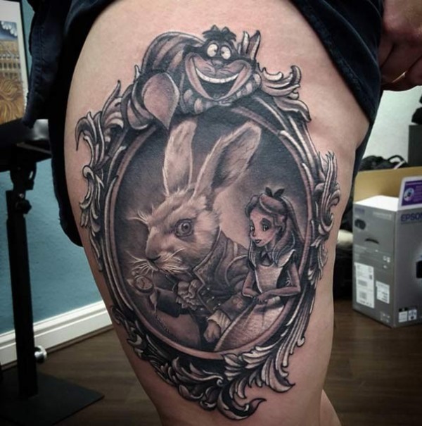 大腿卡通爱丽丝和兔子肖像纹身图案