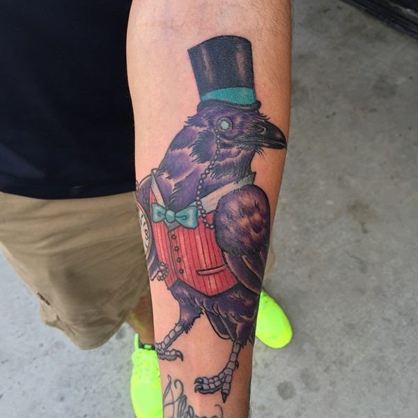 小臂绅士般的紫色卡通乌鸦纹身图案