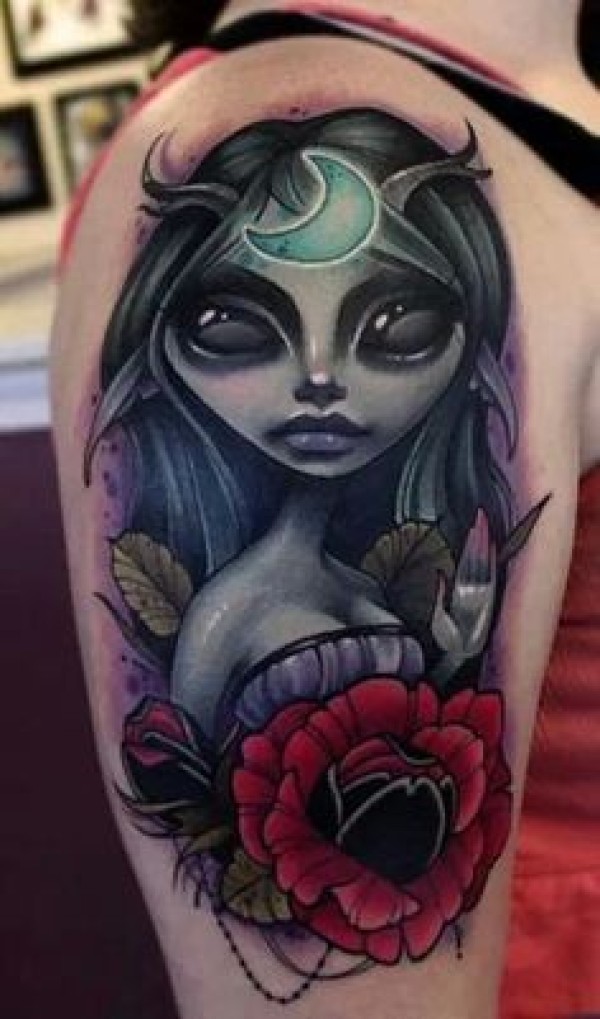 手臂彩色卡通神秘女巫与月亮花朵纹身图案