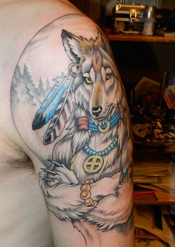 大臂卡通彩色印度狼与羽毛纹身图案