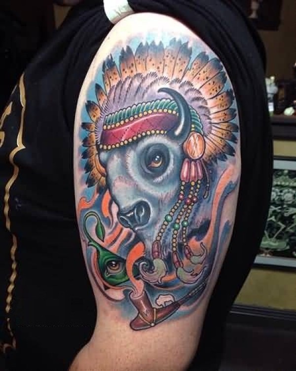 手臂彩色卡通印度野牛与眼睛和吸烟管纹身图案