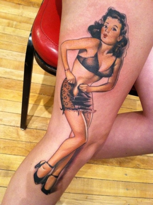 腿部old school彩绘性感女郎纹身图案