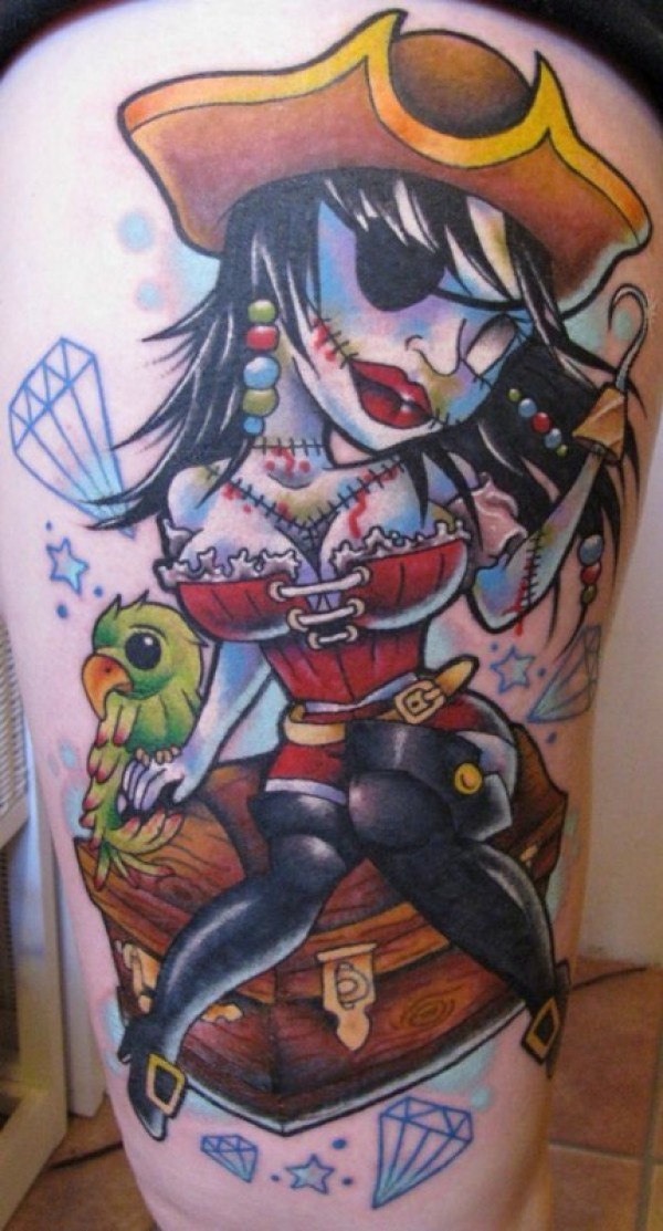 大腿卡通彩色僵尸海盗女孩与鹦鹉和钻石纹身图案