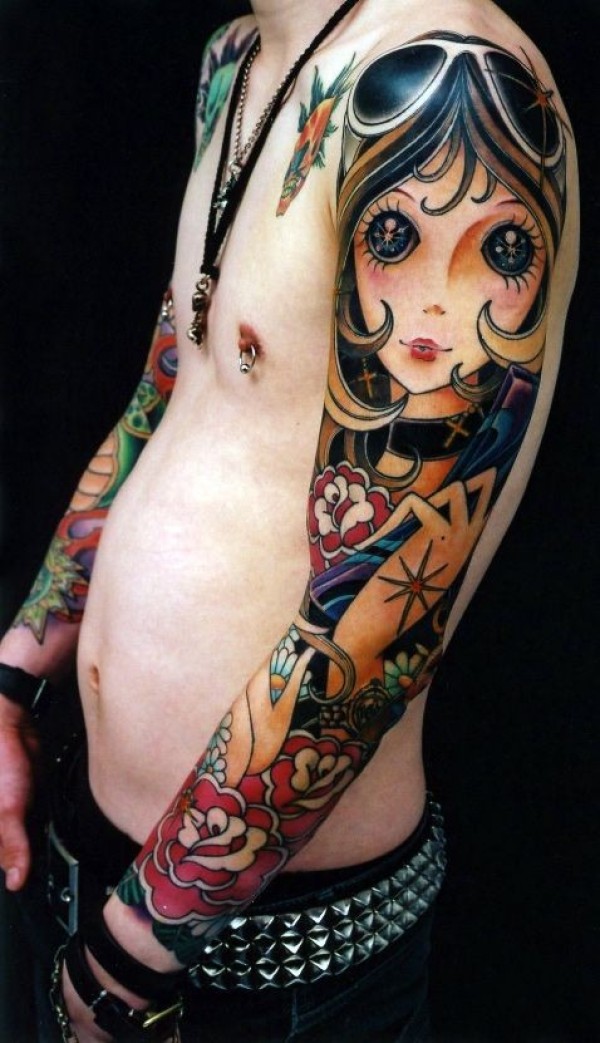 手臂有趣的彩色卡通女孩与花朵纹身图案