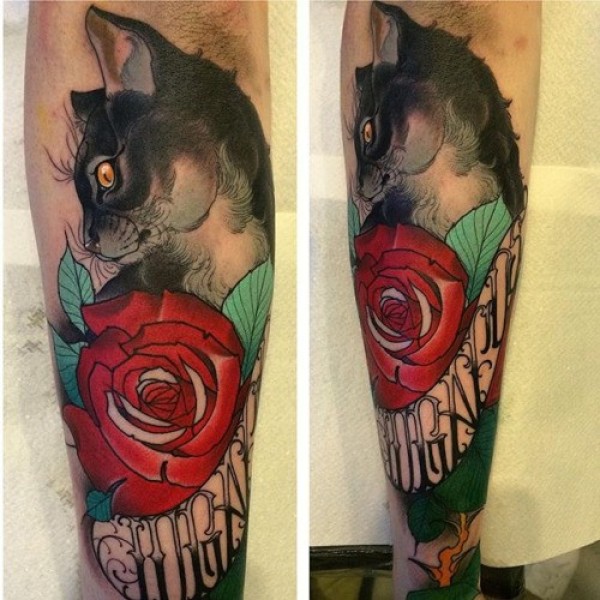 new school小臂猫与玫瑰字母纹身图案