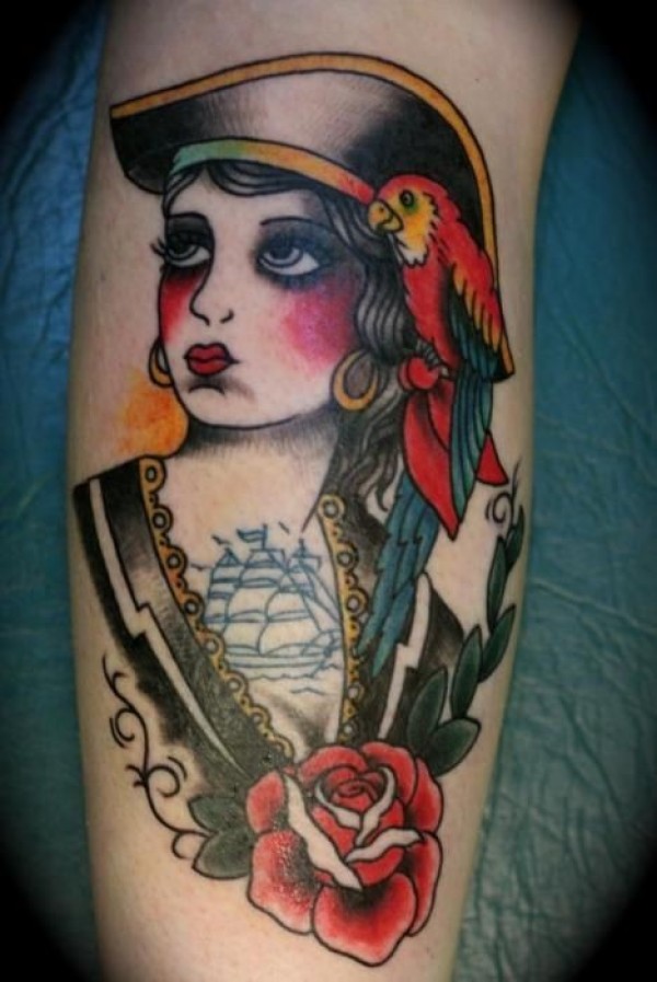 可爱的卡通海盗女郎和鹦鹉纹身图案