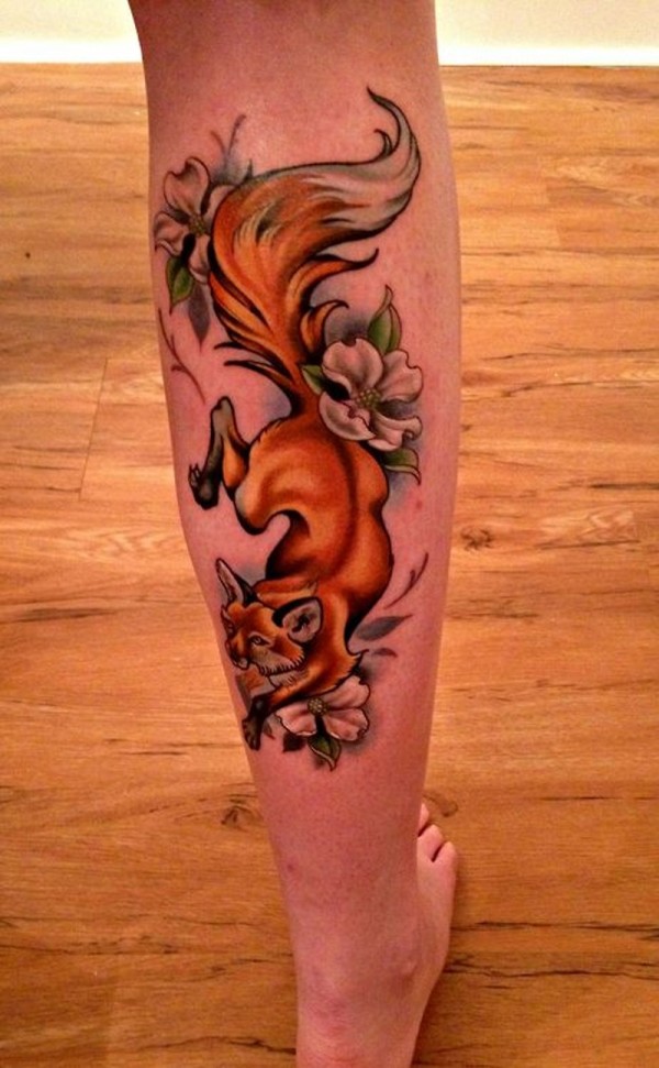 小臂卡通般的彩色小狐狸花朵纹身图案