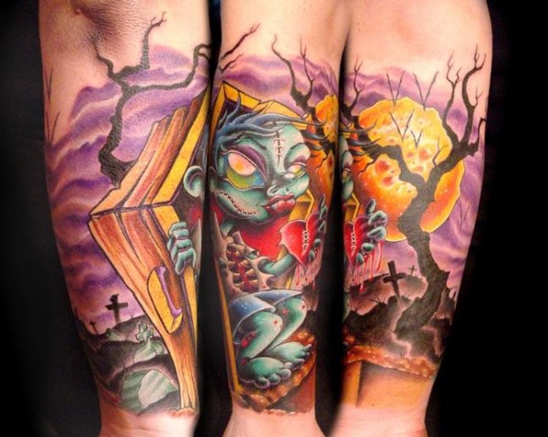 花臂卡通彩色滑稽僵尸和墓地纹身图案