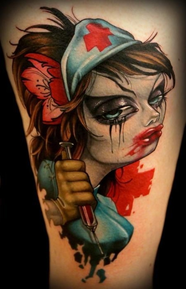 大腿彩色的可怕性感护士纹身图案