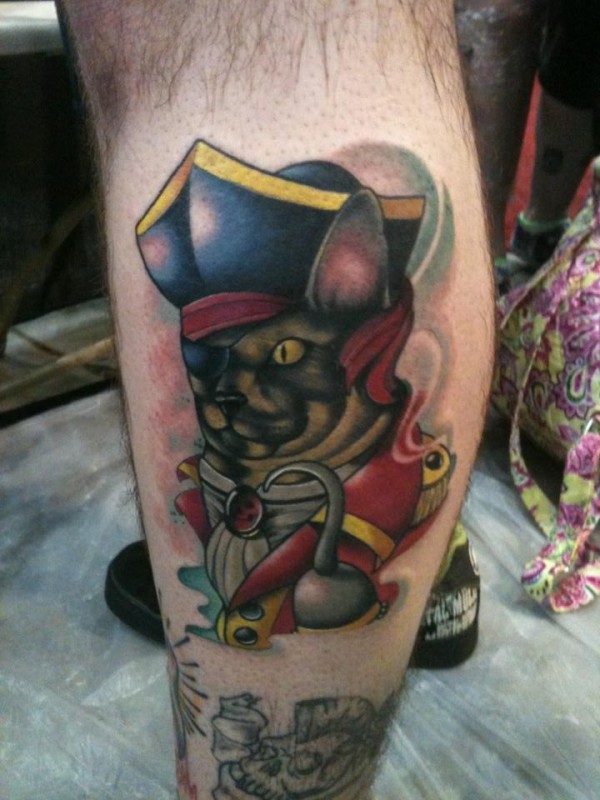 小腿彩色士兵猫纹身图案