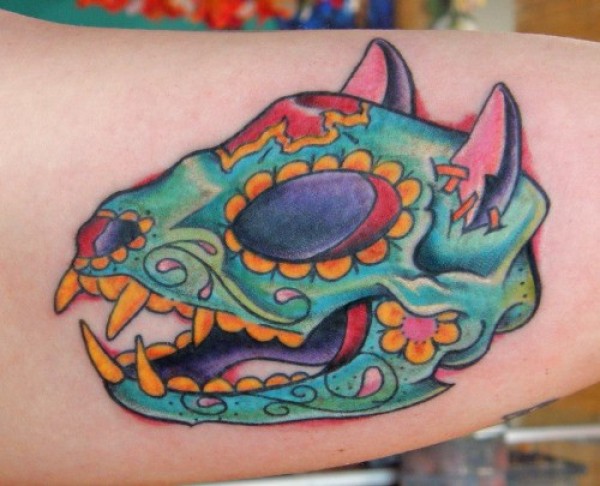 墨西哥风格彩色猫头骨花朵大臂纹身图案