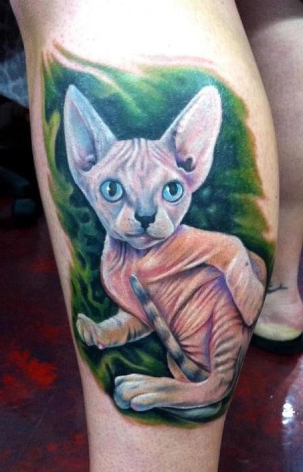 好看的斯芬克斯猫小腿纹身图案