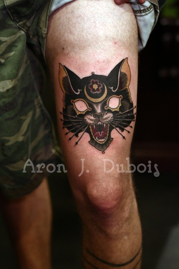插画风格大腿彩色幻想猫面具纹身图案