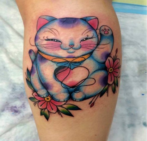 腿部插画风格微笑的招财猫和花朵纹身图案