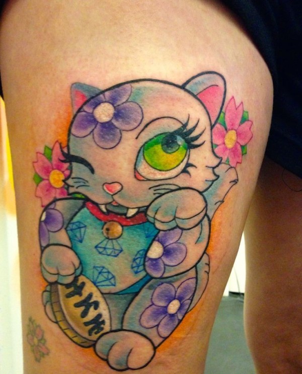 大腿彩色迷人的招财猫和花朵日文纹身图案