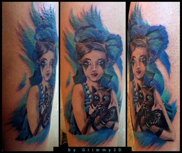 插画风格彩色神奇肖像与猫纹身图案