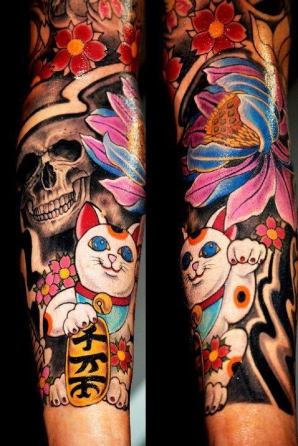 手臂日式彩色招财猫骷髅花朵纹身图案