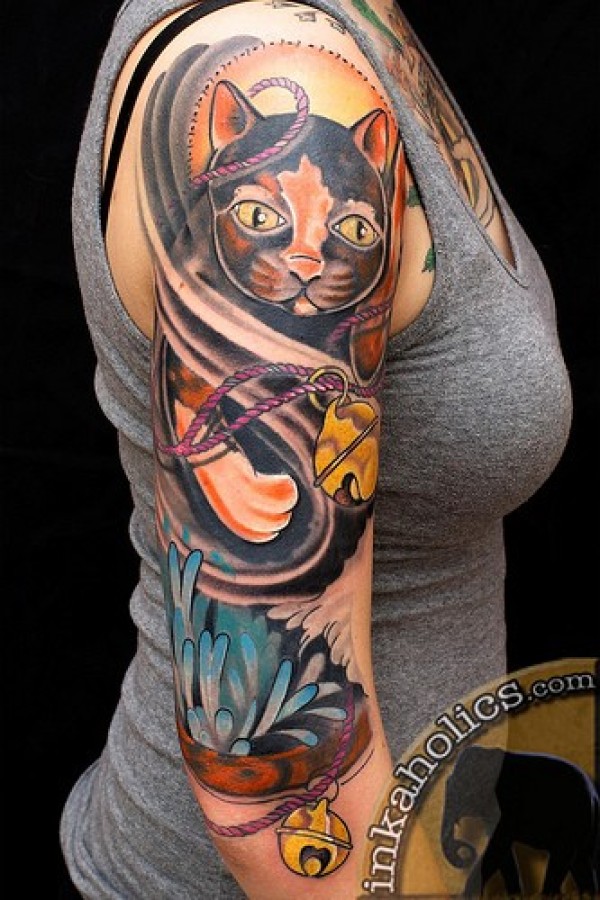 手臂可爱的彩色猫与铃铛花朵纹身图案