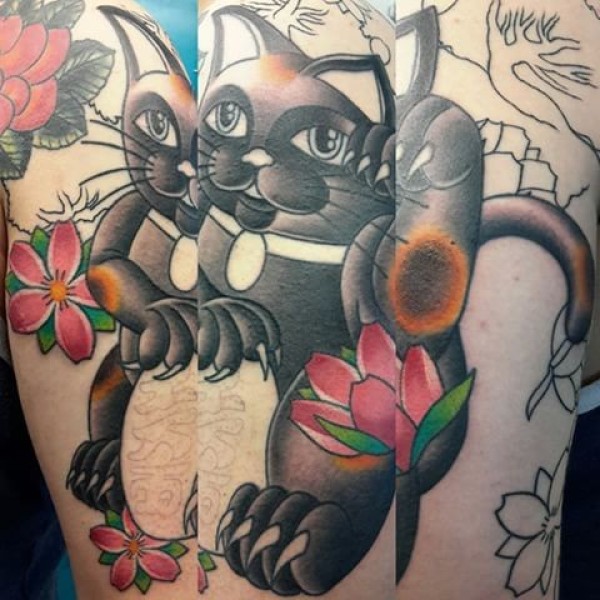 大腿日式招财猫与樱花纹身图案