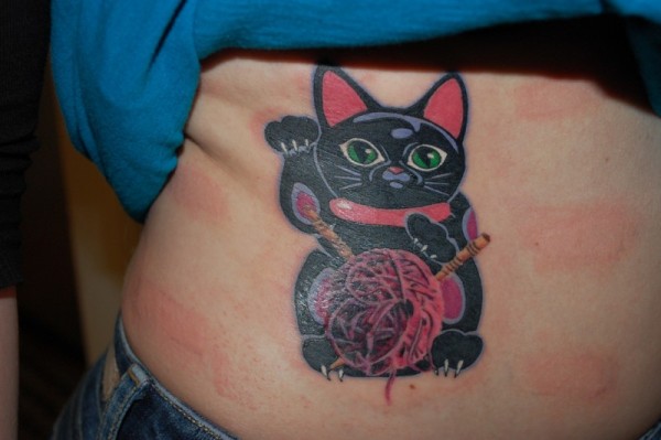 后背黑色的招财猫和毛线球纹身图案