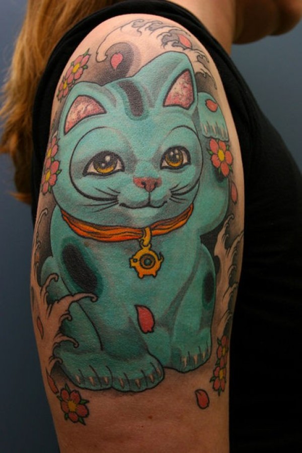 大臂奇妙的五彩可爱招财猫纹身图案