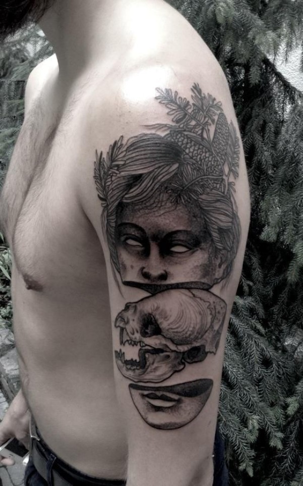 大臂超现实主义风格女人脸和猫头骨纹身图案