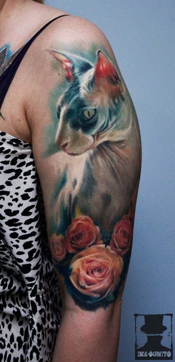 大臂可爱的写实逼真猫与玫瑰纹身图案