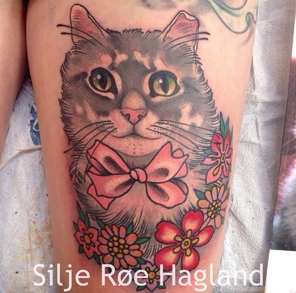 大腿插画风格彩色有趣的猫与花朵纹身图案