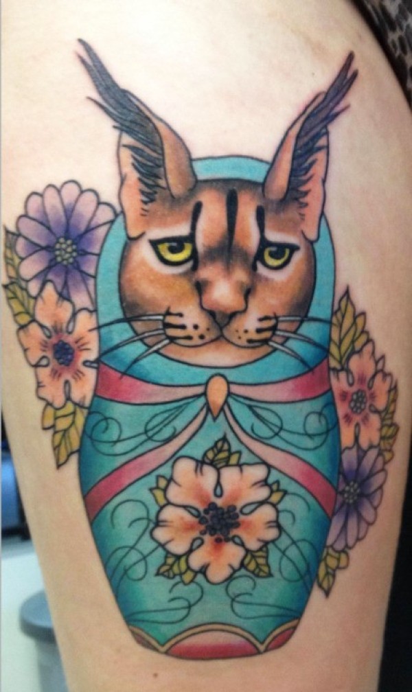 彩色插画风格大腿野猫娃娃和花朵纹身图案