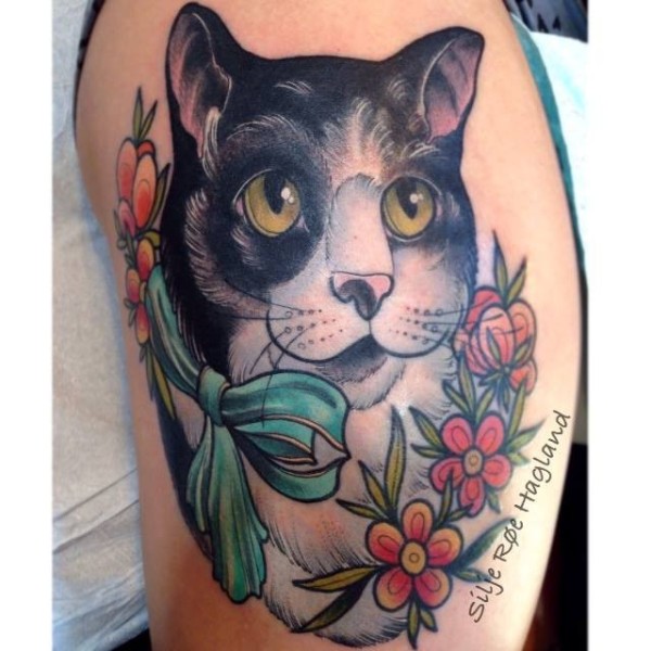 old school彩色猫与蝴蝶结和花朵纹身图案