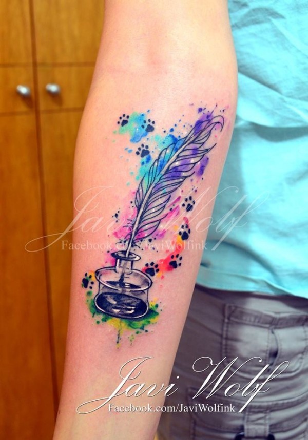 手臂水彩风格的墨水瓶与羽毛和猫爪纹身图案