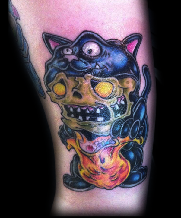 令人毛骨悚然的彩色恶魔骷髅猫纹身图案