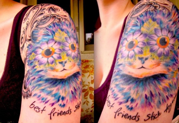 肩部可爱的插画风格猫咪和字母纹身图案